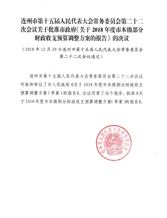 連州市第十五屆人民代表大會常務委員會第二十二次會議關于批準市政府《關于2018年度市本級部分財政收支預算調整方案的報告》的決議