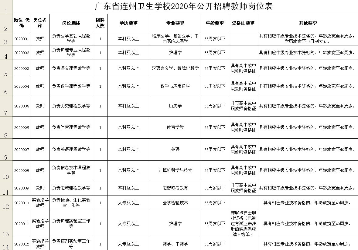 1.《廣東省連州衛(wèi)生學校2020年公開招聘教師崗位表》