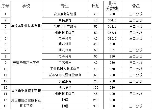 經研究,現公布清遠市第二批中等職業學校(含技工學校)部分專業招生錄取最低控制分數線,具體如下: