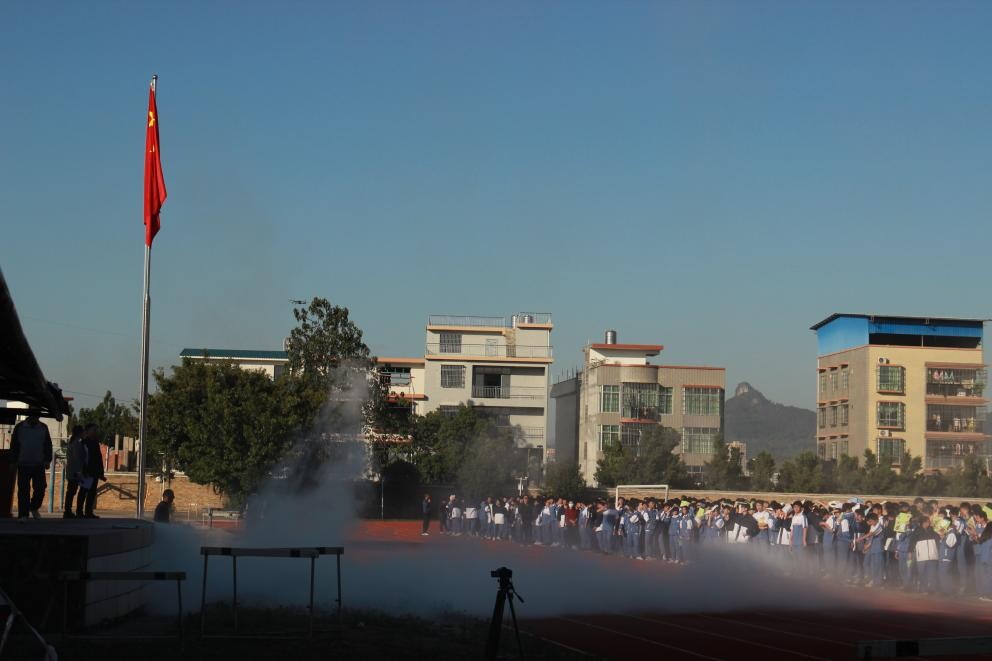 為了確保演練活動落到實處,學校專門成立了演練活動領導小組,制定詳細的演練實施方案。演練前,班主任在班級布置落實演練的時間、地點、內容、疏散路線、程序、紀律、安全要求。下午3:00警報響起,老師立即組織學生進行疏散逃生演練,組織本班學生排隊。撤離時,學生都用濕毛巾捂住鼻子和嘴巴,彎著腰,排成兩列,順著樓梯的扶手,扶著墻壁,在樓層負責老師的指揮下,按疏散路線有秩序地迅速撤離,集合到學校操場上,撤離速度極快。接著后勤科負責老師現場模擬、示范滅火器的使用方法。