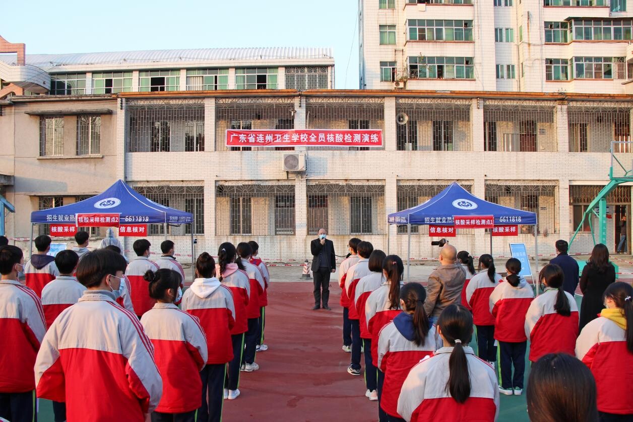 為積極應對隨時可能出現的校園新冠肺炎疫情,做到早發現、早處置、早管控,12月23日下午,廣東省連州衛生學校在學校運動場開展了一場全員核酸檢測應急演練。為確保演練順利進行,提前組織制定了演練方案,21日下午召開現場任務部署會,明確分工,力求演練全程嚴格按照核酸檢測的規范程序進行。