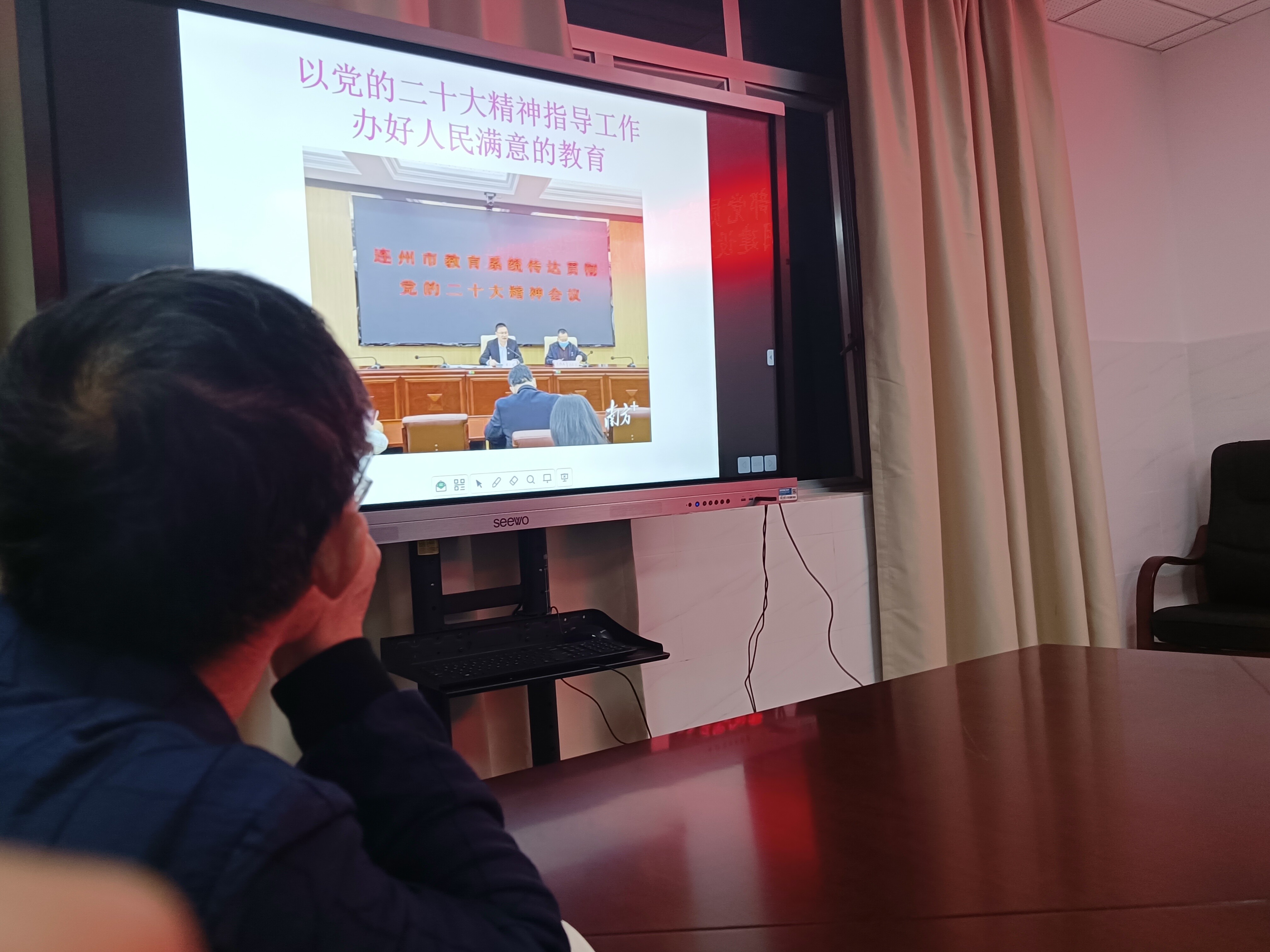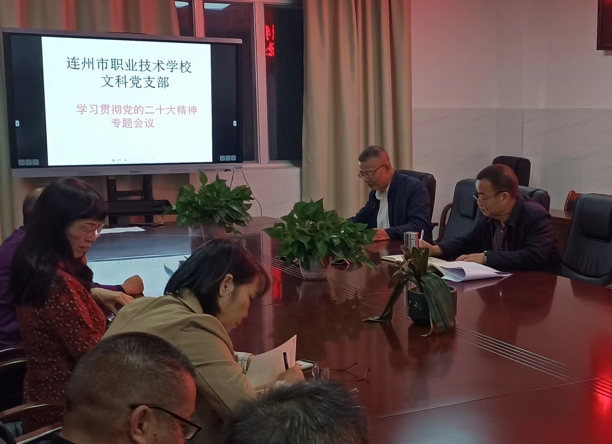 11月15日,連州市職業技術學校文科黨支部在辦公樓506會議室召開全體黨員會議,會議主題為宣講黨的二十大精神。由支部書記張勤同志主持會議。