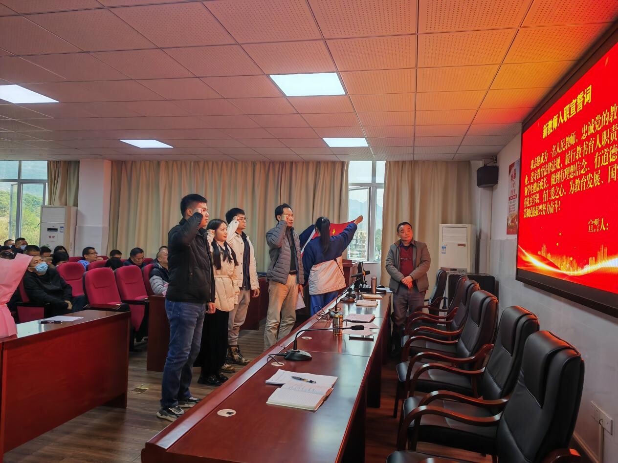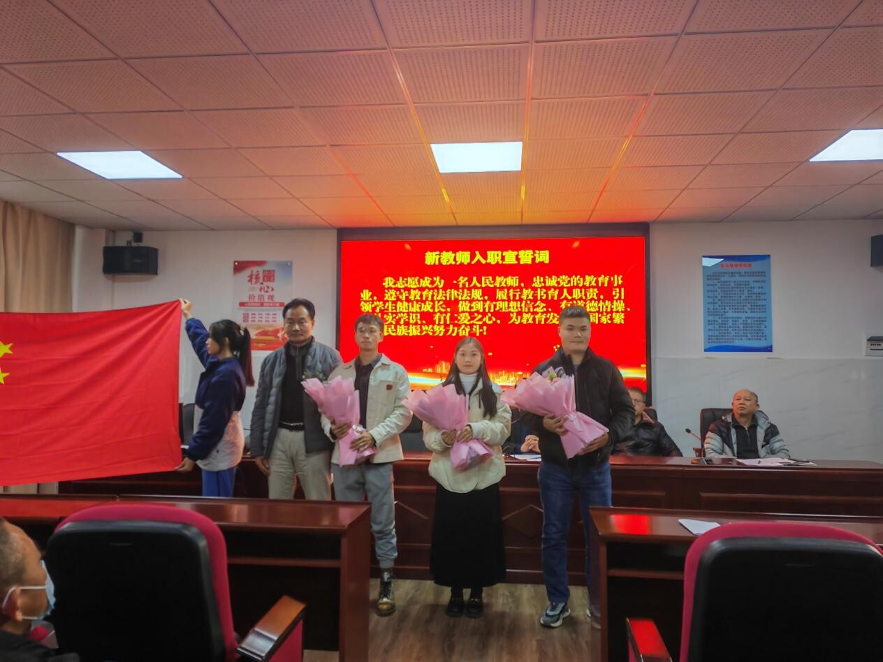 接著,陳卓勛副校長為新教師致歡迎詞,緊接著舉行新教師入職宣誓儀式,由李偉奇書記監誓,陳卓勛副校長領誓,鐘彥文、唐祖梅、蘇墉弘三位新教師面向國旗,莊嚴宣誓。活動中學校工會為每位新教師贈送了精心準備的入職鮮花,祝愿老師們都能從“新”出發,綻放芳華,一路繁花似錦!最后陳卓勛副校長對新老師提出三點要求:一是對待自身,要轉變角色,言行嚴格自律,做好榜樣示范;二是對待學生,要嚴管厚愛,加強理想教育,激勵學生成長進步;三是對待教學,要認真備課,深入鉆研,虛心學習,善于借鑒,在教學事業上不斷成長進步,為學校快速發展貢獻一份力量。