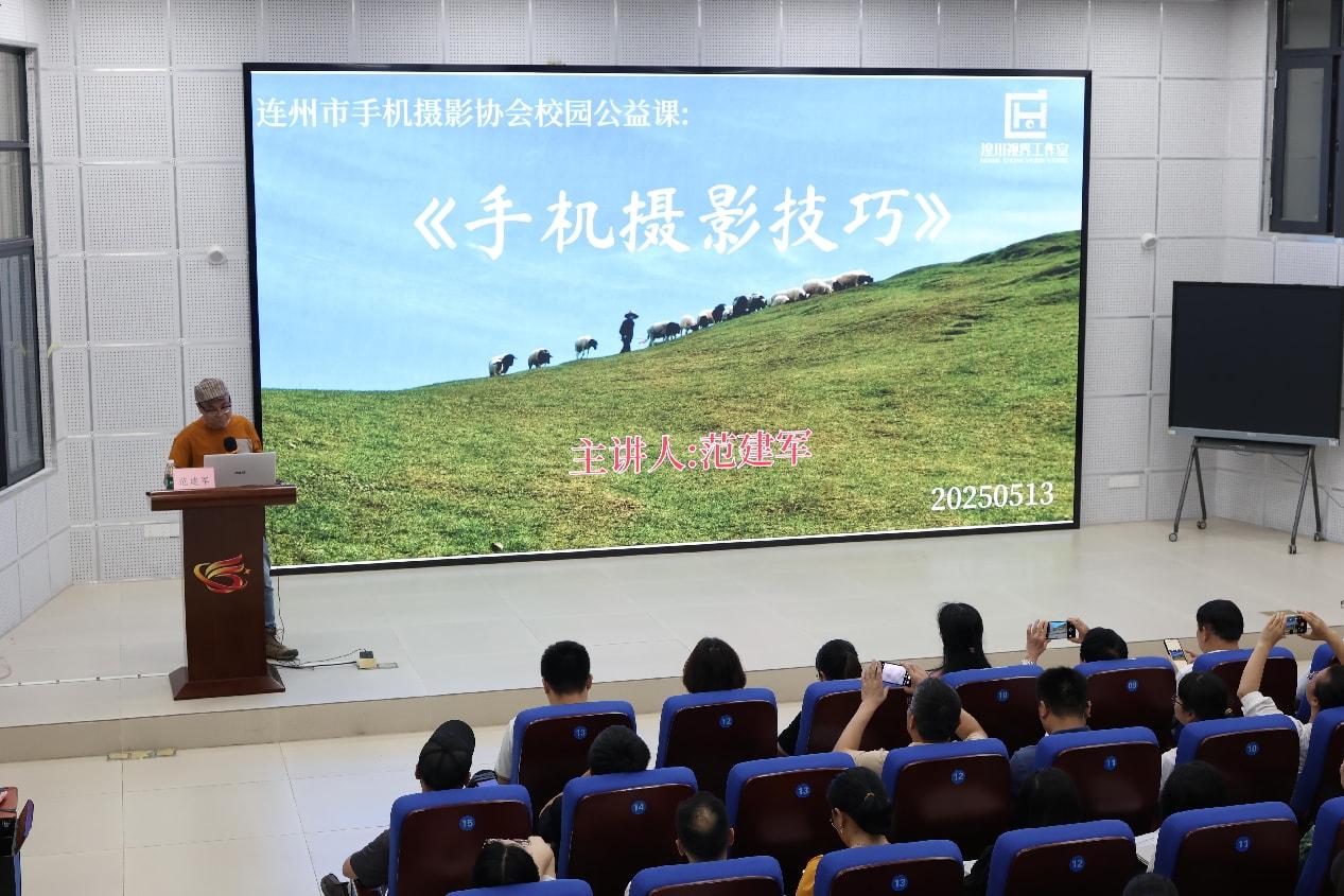 揭牌儀式后,湟川視界工作室負責人范建軍帶來首場特色課程講座——《手機攝影技巧》。通過案例演示與互動問答,現場師生掌握了構圖、光影等實用技能,反響熱烈。