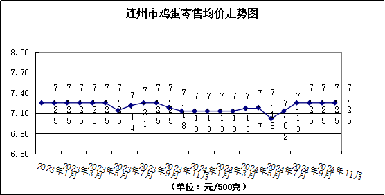 蛋類雞蛋平均零售價格為7.25元/500克,環比不變。鴨蛋平均零售價格為8.63元/500克,環比不變。