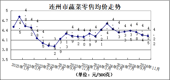 12月份,我市蔬菜價格持續下降,降幅收窄。農貿市場監測的30種主要蔬菜零售價格“10升6平14降”,蔬菜類平均零售價格為4.22元/500克,環比降0.71%。其中,葉菜類零售價格為4.17元/500克,環比降0.48%,花菜類零售價格為3.75元/500克,環比降2.09%,瓜菜類零售價格為4.29元/500克,環比降0.46%,根莖類零售價格為4.37元/500克,環比降1.35%。