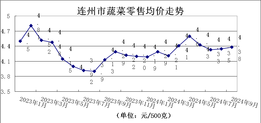 9月份,我市蔬菜價格微升,農(nóng)貿(mào)市場監(jiān)測的30種主要蔬菜零售價格“15510蔬菜類平均零售價格為4.38/500克,環(huán)比升0.69%。其中,葉菜類零售價格為4.45/500克,環(huán)比升1.14%,花菜類零售價格為3.96/500克,環(huán)比升6.17%,瓜菜類零售價格為4.20/500克,環(huán)比降0.24%,根莖類零售價格為4.65/500克,環(huán)比降0.21%