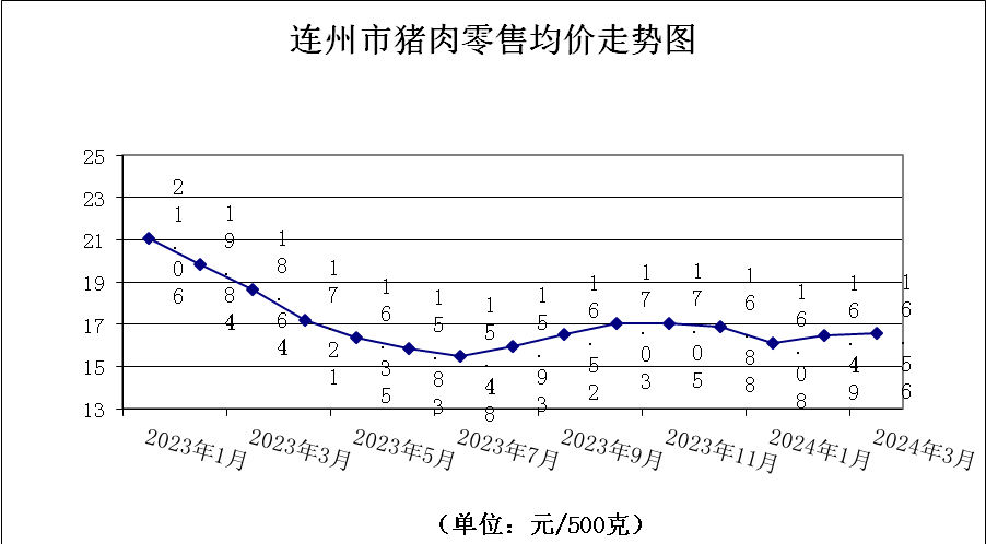 3月份,我市豬肉零售價格升幅收窄,豬肉價格微升。農貿市場監測的四種主要豬肉零售均價為16.56元/500克,環比升0.42%。其中,排骨20.24元/500克,環比降1.41%;精瘦肉17.00元/500克,環比升1.13%;肋條肉14.50元/500克,環比升1.33%,有皮上肉14.50元/500克,環比升1.33%。