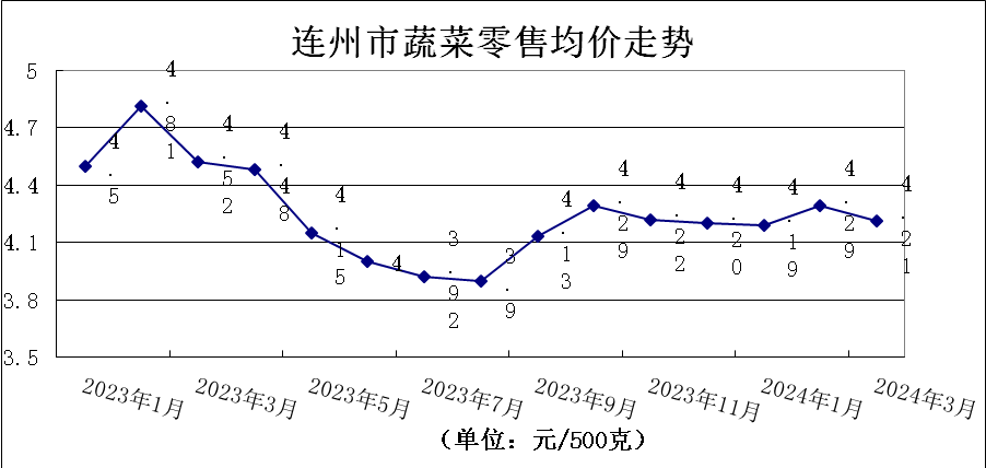 3月份,我市蔬菜零售價格小幅下降。農貿市場監測的30種主要蔬菜零售價格“7升7平16降”,蔬菜類平均零售價格為4.21元/500克,環比降1.86%。其中,葉菜類零售價格為4.05元/500克,環比降3.80%,花菜類零售價格為3.68元/500克,環比升1.66%,瓜菜類零售價格為4.44元/500克,環比降0.22%,根莖類零售價格為4.41元/500克,環比降1.34%。