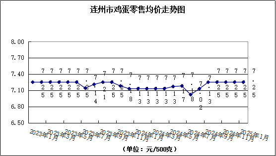 蛋類雞蛋平均零售價格為7.25元/500克,環比不變。鴨蛋平均零售價格為8.63元/500克,環比不變。