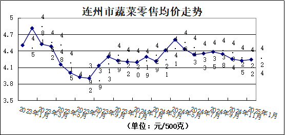 1月份,我市蔬菜價格止跌微升。農貿市場監測的30種主要蔬菜零售價格“13升8平9降”,蔬菜類平均零售價格為4.24元/500克,環比升0.47%。其中,葉菜類零售價格為4.08元/500克,環比降2.16%,花菜類零售價格為3.88元/500克,環比升3.47%,瓜菜類零售價格為4.43元/500克,環比升3.26%,根莖類零售價格為4.39元/500克,環比升0.46%。