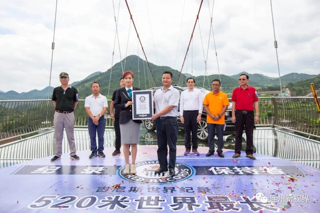 當天上午,吉尼斯世界紀錄的認證官侯穎在九陂鎮領導和廣汽集團、愛地旅游、擎天旅游有關負責人的陪同下,乘坐廣汽傳祺SUV,橫跨玻璃橋,成功抵達4號觀景臺,并在玻璃橋上宣布:擎天玻璃橋有效長度為526.14米,成功打破這項全新的吉尼斯世界紀錄稱號。