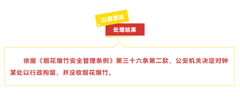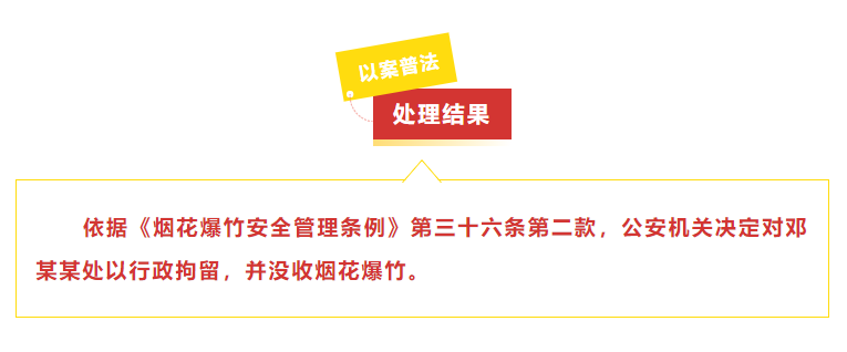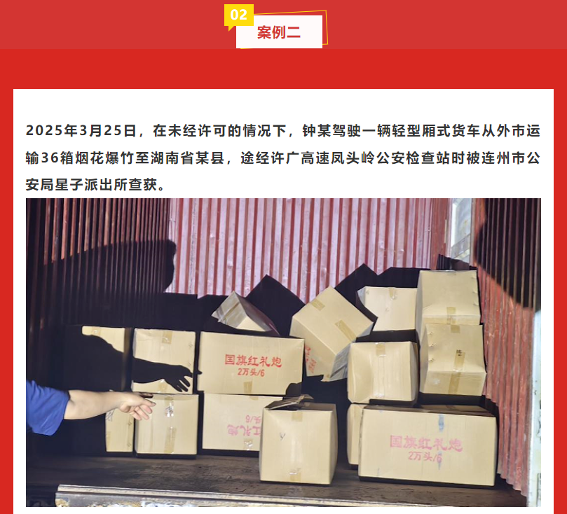 2025年3月24日凌晨,在未經(jīng)許可的情況下,鄧某某駕駛一輛面包車從外縣非法運輸9箱煙花爆竹至湖南省某縣,途經(jīng)我市轄區(qū)時被連州市公安局大路邊派出所查獲。 1、什么是非法生產(chǎn)、銷售、運輸、儲存煙花爆竹? 非法生產(chǎn)、銷售、運輸、儲存煙花爆竹是指單位或個人未經(jīng)國家許可從事生產(chǎn)、銷售、運輸、儲存煙花爆竹的行為。 2、非法生產(chǎn)危害性 非法生產(chǎn)煙花爆竹的危害性極大,極易造成群死群傷的災(zāi)難性后果。從事非法生產(chǎn)煙花爆竹活動不但自身具有高度危險性,而且危害正常的生產(chǎn)活動,同時也對社會公共安全具有潛在的、間接的威脅。 3、非法銷售危害性 非法購銷的煙花爆竹,未經(jīng)有關(guān)部門依法審查或未辦理購銷等手續(xù)而直接進入市場,在經(jīng)營成本上較為低廉且缺乏嚴格的管理,質(zhì)量無法得到保證,極易引發(fā)安全事故。 4、非法運輸危害性 非法運輸煙花爆竹車輛沒有相應(yīng)資質(zhì),不具備運輸煙花爆竹條件,運輸過程中如果發(fā)生擠壓、碰撞,極易引起爆炸和燃燒事故,對道路運輸安全造成極大危害。 5 非法儲存危害性 非法儲存煙花爆竹窩點周圍環(huán)境、人員等較為復(fù)雜。若大量煙花爆竹堆放在狹小空間里,對周邊的居民構(gòu)成極大的威脅。一旦遇到火星將產(chǎn)生極其嚴重的后果。 法律鏈接 經(jīng)由道路運輸煙花爆竹的 應(yīng)當(dāng)經(jīng)公安部門許可 煙花爆竹作為燃燒爆炸物品,從生產(chǎn)、經(jīng)營、儲存、運輸、燃放到廢棄銷毀,都具有高危屬性。國家對煙花爆竹的運輸實行許可證制度,未經(jīng)許可,任何單位或者個人不得運輸煙花爆竹。 《煙花爆竹安全管理條例》第二十二條第一款: 經(jīng)由道路運輸煙花爆竹的,應(yīng)當(dāng)經(jīng)公安部門許可。 《煙花爆竹安全管理條例》第二十五條: 經(jīng)由道路運輸煙花爆竹的,除應(yīng)當(dāng)遵守《中華人民共和國道路交通安全法》外,還應(yīng)當(dāng)遵守下列規(guī)定: (一)隨車攜帶《煙花爆竹道路運輸許可證》; (二)不得違反運輸許可事項; (三)運輸車輛懸掛或者安裝符合國家標準的易燃易爆危險物品警示標志; (四)煙花爆竹的裝載符合國家有關(guān)標準和規(guī)范; (五)裝載煙花爆竹的車廂不得載人; (六)運輸車輛限速行駛,途中經(jīng)停必須有專人看守; (七)出現(xiàn)危險情況立即采取必要的措施,并報告當(dāng)?shù)毓膊块T。 《煙花爆竹安全管理條例》第三十六條: 對未經(jīng)許可生產(chǎn)、經(jīng)營煙花爆竹制品,或者向未取得煙花爆竹安全生產(chǎn)許可的單位或者個人銷售黑火藥、煙火藥、引火線的,由安全生產(chǎn)監(jiān)督管理部門責(zé)令停止非法生產(chǎn)、經(jīng)營活動,處2萬元以上10萬元以下的罰款,并沒收非法生產(chǎn)、經(jīng)營的物品及違法所得。 對未經(jīng)許可經(jīng)由道路運輸煙花爆竹的,由公安部門責(zé)令停止非法運輸活動,處1萬元以上5萬元以下的罰款,并沒收非法運輸?shù)奈锲芳斑`法所得。 非法生產(chǎn)、經(jīng)營、運輸煙花爆竹,構(gòu)成違反治安管理行為的,依法給予治安管理處罰;構(gòu)成犯罪的,依法追究刑事責(zé)任。 《中華人民共和國治安管理處罰法》第三十條: 違反國家規(guī)定,制造、買賣、儲存、運輸、郵寄、攜帶、使用、提供、處置爆炸性、毒害性、放射性、腐蝕性物質(zhì)或者傳染病病原體等危險物質(zhì)的,處十日以上十五日以下拘留;情節(jié)較輕的,處五日以上十日以下拘留。 警惕煙花爆竹引發(fā)的消防安全問題 警惕違規(guī)存儲煙花爆竹。煙花爆竹對于存儲條件有極高的要求,個人與單位盡可能減少煙花爆竹存儲數(shù)量、縮短儲存時間, 燃放煙花爆竹,應(yīng)當(dāng)按照燃放說明燃放,不得以危害公共安全和人身、財產(chǎn)安全的方式燃放煙花爆竹。 《煙花爆竹安全管理條例》第二十八條: 燃放煙花爆竹,應(yīng)當(dāng)遵守有關(guān)法律、法規(guī)和規(guī)章的規(guī)定。縣級以上地方人民政府可以根據(jù)本行政區(qū)域的實際情況,確定限制或者禁止燃放煙花爆竹的時間、地點和種類。 注意!并不是所有的地區(qū)都允許燃放煙花爆竹,若在禁止燃放區(qū)域燃放煙花爆竹,是違法行為。