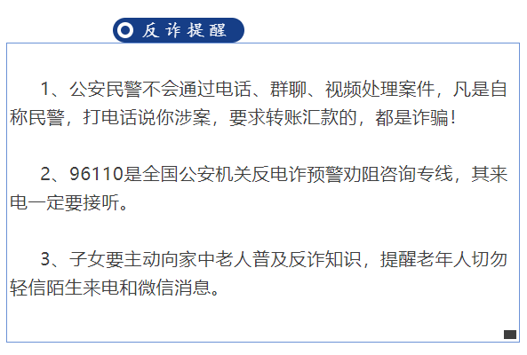 2025年4月24日,連州鎮鎮郊社區一女子在家中通過某社交軟件認識一名陌生人,其冒充警察說該女子涉嫌詐騙,需要該女子配合,之后該女子按照對方的引導操作手機,操作后發現其父親銀行卡的錢全被對方轉走了,最終該女子被詐騙3.9萬元人民幣。