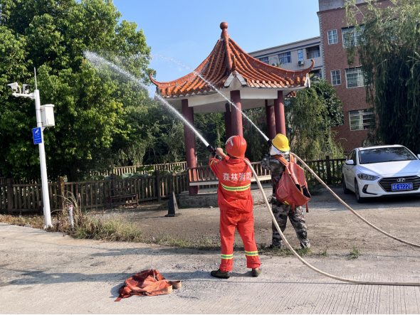 在實戰演練方面,九陂鎮在龍崗村成功模擬了一次山火撲滅演練。演練中,隊員們迅速響應、協同作戰,利用消防車輛和水槍等裝備,對模擬的山火進行了有效的撲救。演練不僅檢驗了隊伍受訓成果,更在實戰中錘煉了隊伍的應急反應能力和協同作戰能力。