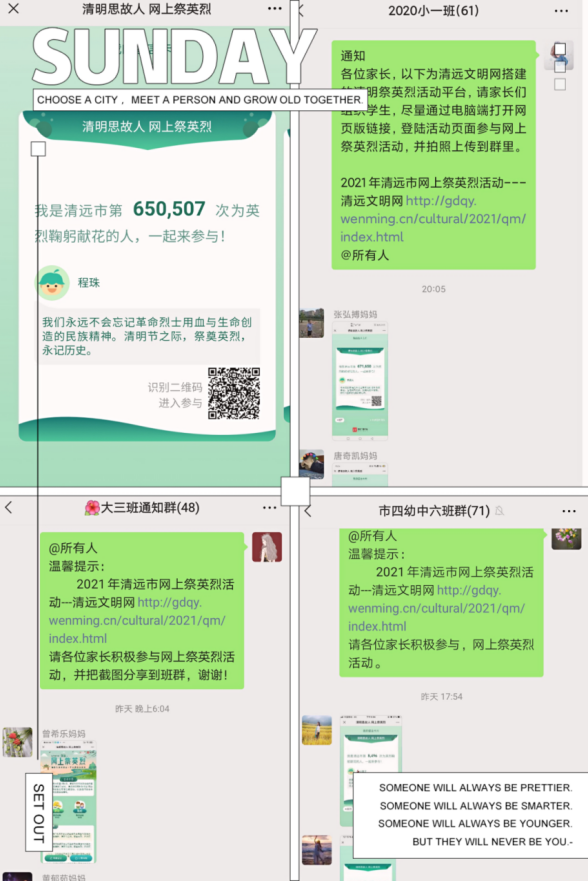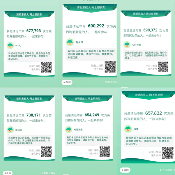 組織廣大教師,家長和幼兒大手牽小手登錄中國文明網、央視網、“文明清遠”公眾號等平臺,通過在網上向先賢先烈鞠躬獻花、抒寫感言寄語的方式,表達對先烈先賢的感恩和敬仰,繼承和發揚革命精神。