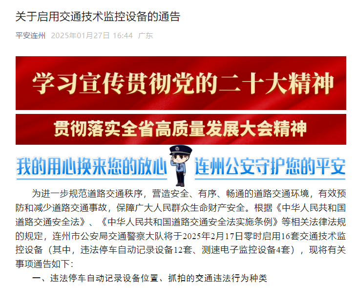 今年1月17日,我局交通警察大隊在平安連州發布公告:為進一步規范道路交通秩序,營造安全、有序、暢通的道路交通環境,有效預防和減少道路交通事故,保障廣大人民群眾生命財產安全。根據《中華人民共和國道路交通安全法》、《中華人民共和國道路交通安全法實施條例》等相關法律法規的規定,連州市公安局交通警察大隊將于2025年2月17日零時啟用16套交通技術監控設備(其中,違法停車自動記錄設備12套、測速電子監控設備4套),抓拍“機動車違反規定停放、臨時停車,駕駛人不在現場或者雖在現場但駕駛人拒絕立即駛離,妨礙其它車輛、行人通行的”以及駕駛機動車超速行駛等道路交通違法行為,并依法進行處罰。