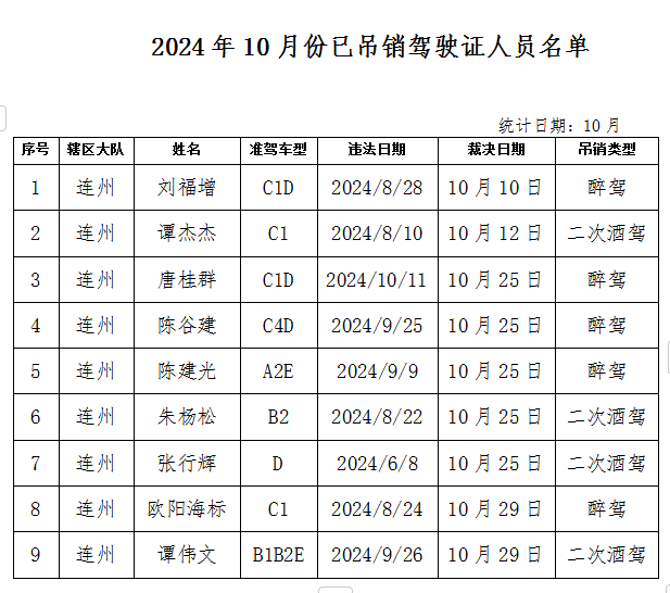 2024年10月被吊銷駕駛證的駕駛人名單曝光