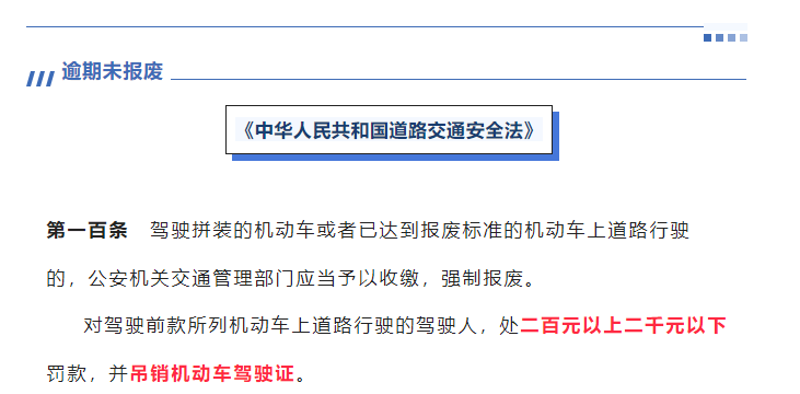 連續三個周期未年檢車輛屬報廢車輛,駕駛報廢車輛上路,交警部門一經查實,將依法吊銷駕駛人的駕駛證。