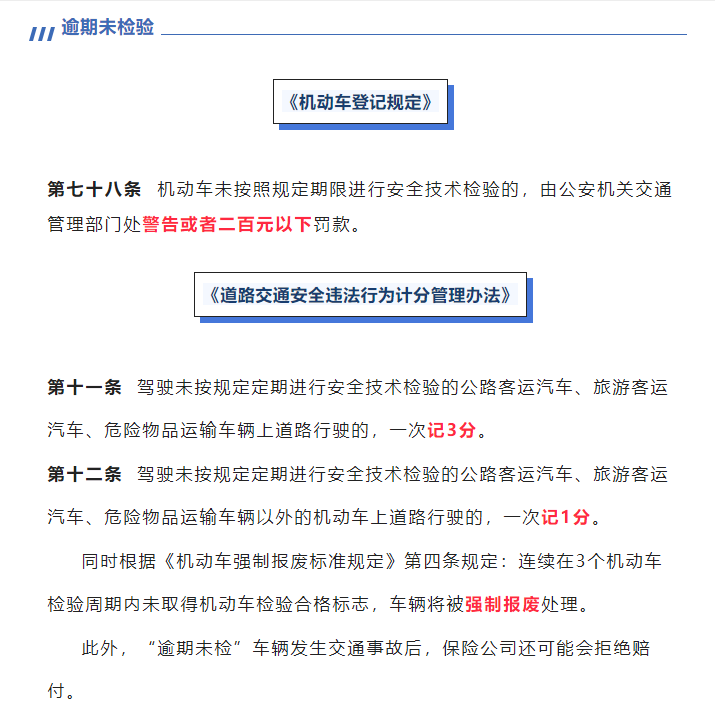 未年檢車輛上路一經查實,交警部門將暫扣機動車,進行罰款、扣分。對沒買交強險上路行駛的車輛,交警部門有權扣留機動車,并通知機動車所有人、管理人依照規定投保,并處應繳納的保險費的2倍罰款。